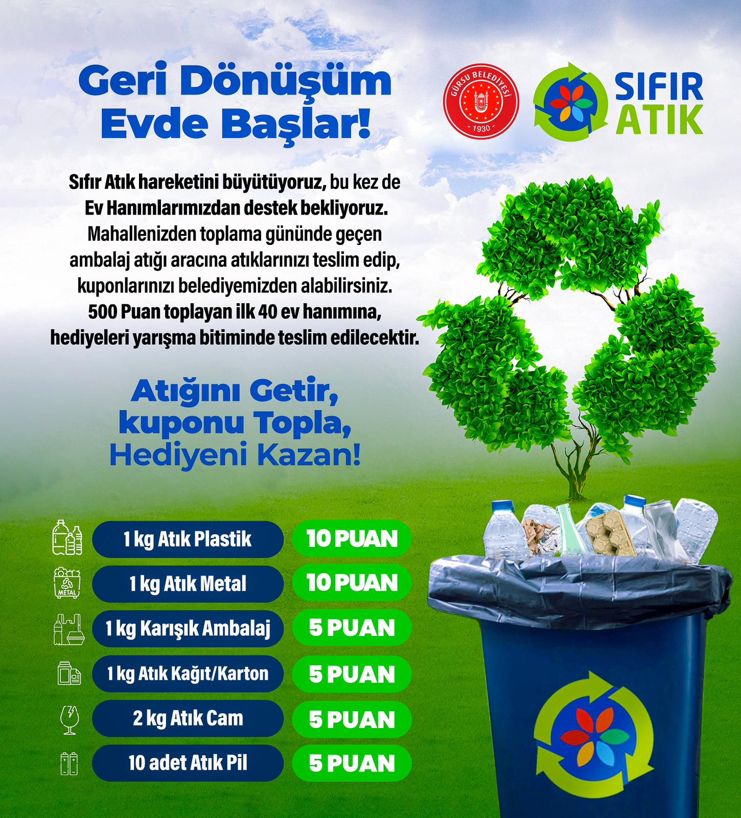 Geri Dönüşüm Evde Başlar yarışması özellikle Gürsu’daki ev hanımlarının dikkatini çekmek amacıynı taşıyor. Ev hanımları ülke genelinde etkisini gösteren Sıfır Atık hareketine Gürsu Belediyesi’nin yeni yarışması kapsamında dahil etmiş olunacak. 1 Şubat tarihinde başlayan yarışma 31 Mayıs’a kadar geçerli olacak. Mahallelerinden geçen ambalaj atığı toplama aracına en çok atığı teslim ederek 500 puan toplayan ev hanımları yarışma kapsamında ödüllendirilecek. Toplanan puanlar Gürsu Belediyesi İklim Değişikliği ve Sıfır Atık Müdürlüğü’nden teslim alınarak yarışmaya katılım gerçekleşecek. Yarışma sonunda ev hanımlarına sürpriz hediyeler takdim edilecek.