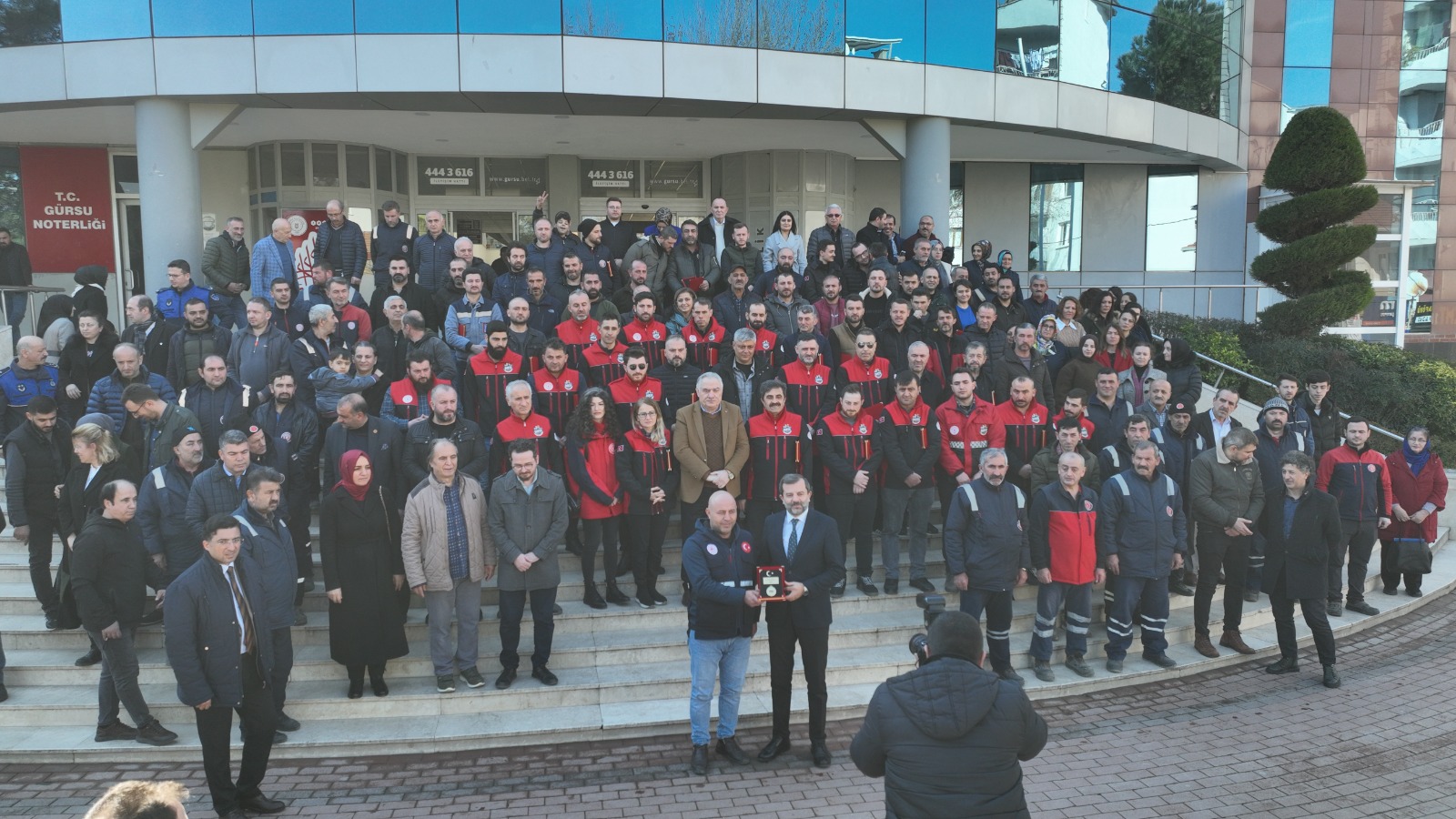 Gürsu Belediye Başkanı Mustafa Işık, deprem bölgesinde bir umut eli olmak için günlerdir mücadele eden Gürak ekibinin üyelerini düzenlenen törende plaketle ödüllendirdi. Ayrıca belediyenin farklı birimlerinde çalışan ve belediye çalışanlarından oluşan yerel destek ekibine de teşekkür plaketleri takdim edildi. Başkan Işık, iyi günlerde kullanılması temennisiyle, ekibe yeni araç aldıklarının müjdesini de verdi.