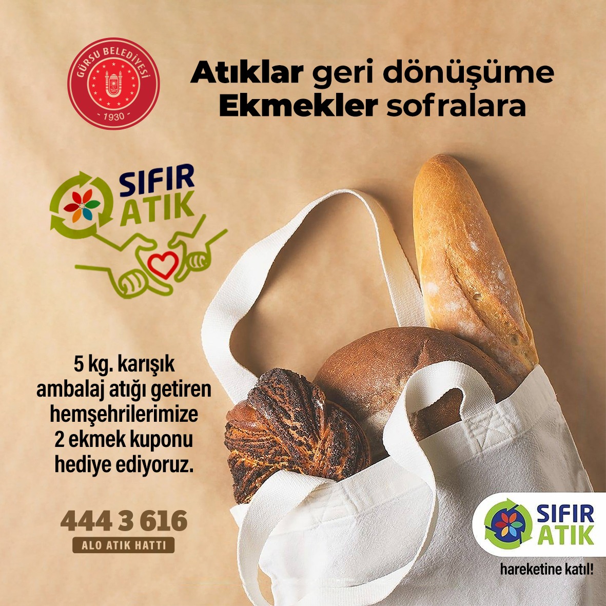 Gürsu Belediyesi İklim Değişikliği ve Sıfır Atık Müdürlüğü’nce, “Atıklar geri dönüşüme ekmekler sofralara” sloganıyla başlatılan kampanya kapsamında, 5 kg karışık ambalaj atığı getiren 2 ekmek alabiliyor.