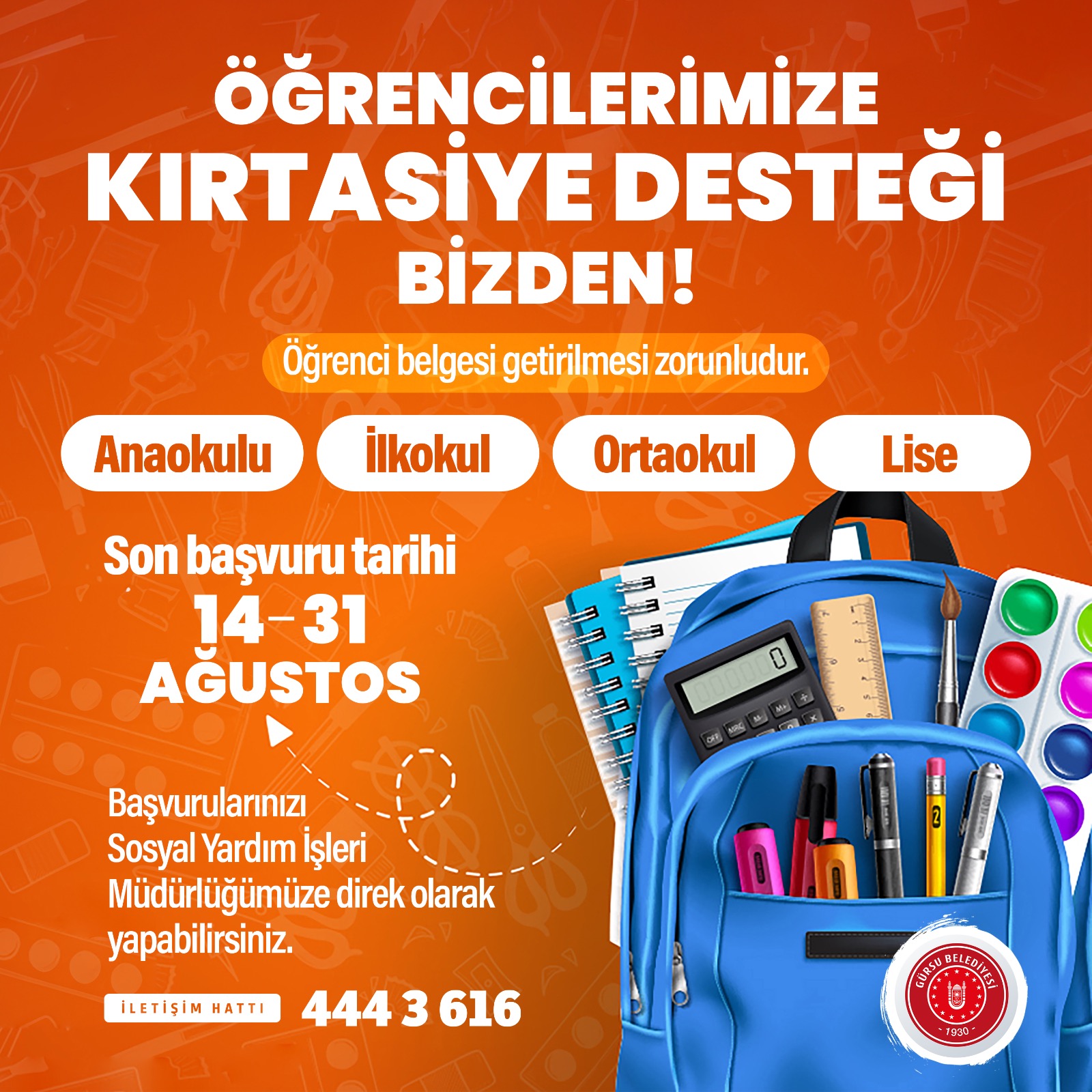 Gürsu Belediyesi her yıl yaptığı öğrencilere kırtasiye desteğini bu yıl da yerine getirmek için başvuruları almaya başladı. İlçede yüzlerce öğrenci okula Gürsu Belediyesi’nin desteği ile başlamış olacak.