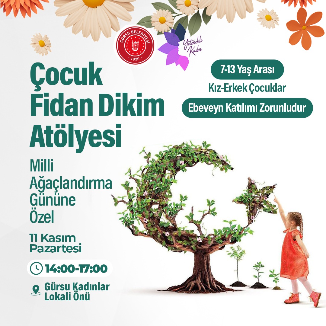 Milli Ağaçlandırma Günü’ne özel olarak, 7-13 yaş arası kız ve erkek çocuklar için düzenlenecek “Çocuk Fidan Dikim Atölyesi” 11 Kasım Pazartesi, 14:00-17:00 saatleri arasında Gürsu Kadınlar Lokali’nde gerçekleştirilecek.