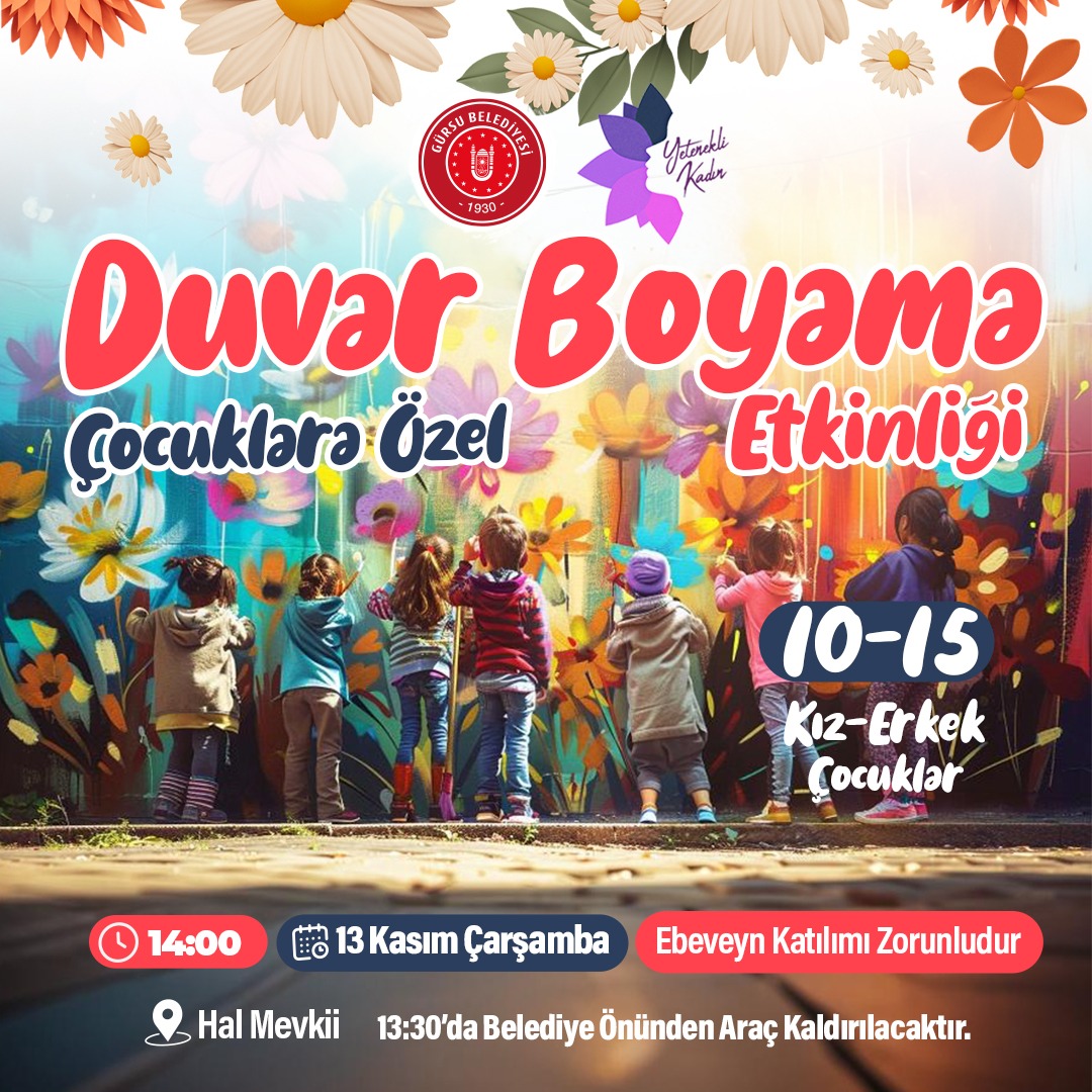 10-15 yaş arası kız ve erkek çocuklar için düzenlenecek “Duvar Boyama Etkinliği”, 13 Kasım Çarşamba, saat 14:00’te, Hal Mevkii’nde gerçekleştirilecek olup, 13:30’da Belediye önünden araç kaldırılacak.