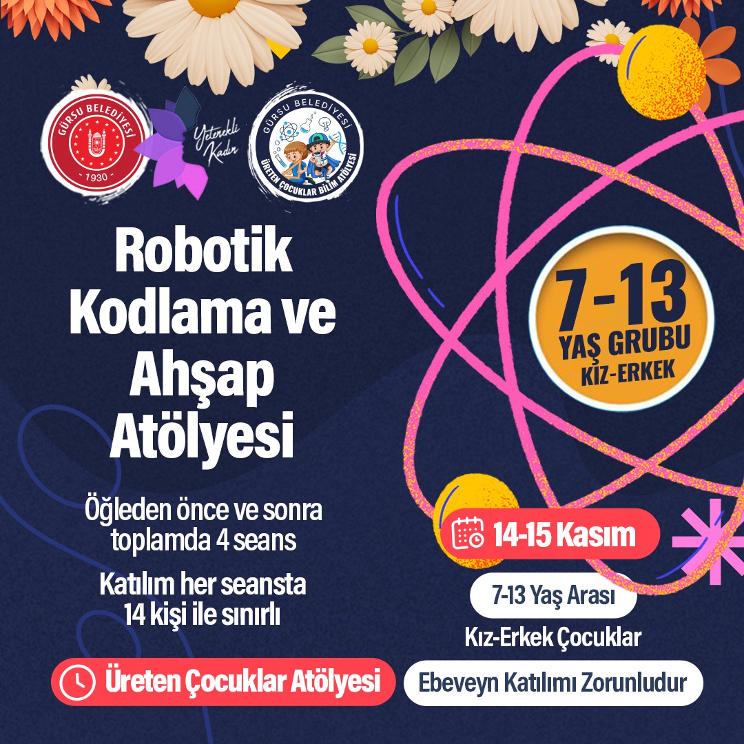 7-13 yaş arası kız ve erkek çocuklar için düzenlenecek “Robotik Kodlama ve Ahşap Atölyesi”, öğleden önce ve sonra dört seans olarak, 14 kişilik sınıflarda, 14-15 Kasım tarihlerinde, Üreten Çocuklar Atölyesi’nde gerçekleştirilecek.